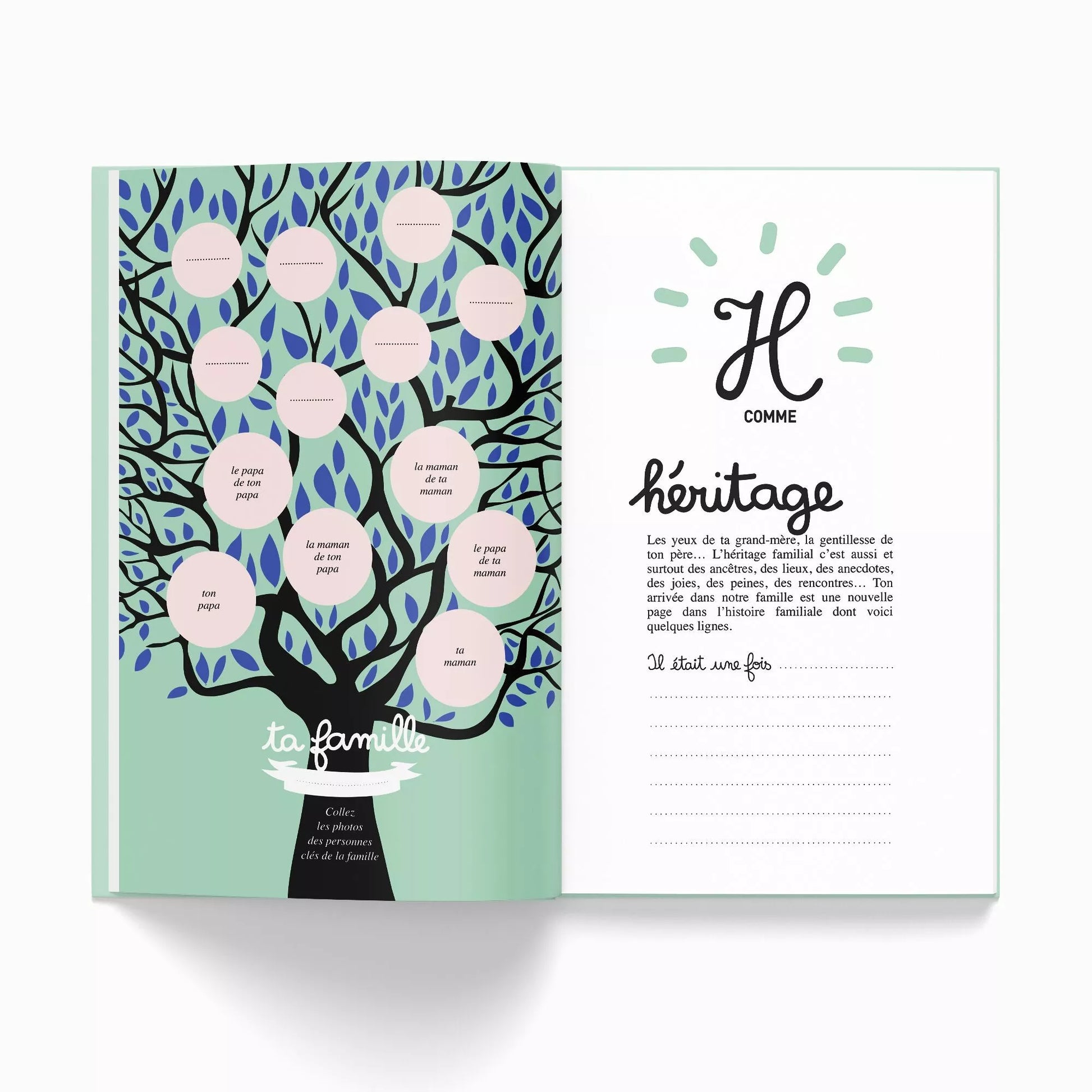 Chaque lettre de A à Z raconte son histoire. Des pages authentiques, des touches d’humour, des espaces pour écrire, coller des photos, raconter : votre histoire devient un album vivant, sincère, à votre image.